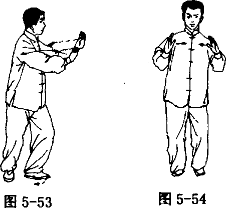 接前式,右脚跟里转,全脚踏实(脚尖向南 >,左脚以脚跟为轴, 脚尖右扣约90°着地,脚跟抬起;身体随着右转(胸向南),重心偏向 右腿;同时两手心相对,指尖向上,向左右分开,两手虎口与两肩相 对,微停(图5-54)。