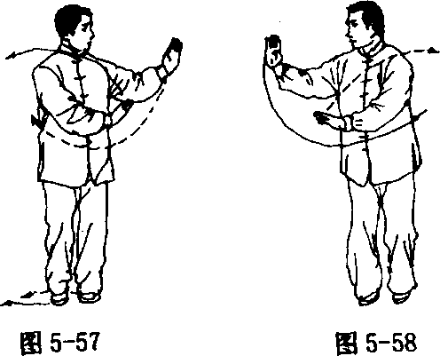② 转身云转 右脚向右横跨一步,随即左脚收于右脚内侧, 脚尖着地,重心偏于右腿;同时上体微右转,右手向上、向右划弧至 身体右前方,手腕髙与肩平,手指向上,手心向右前方;左手向下、 向右经腹前向上划弧至右腹前,手心斜向下;眼看右手(图5- 58)。如此循环做3次(图5-59?62)。