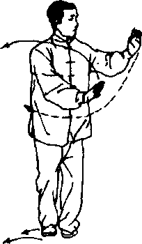 ① 在左右手向上划弧时,掌心均向外,高不过眉;身随手转。