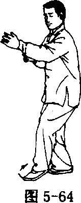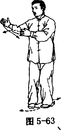 ① 扣脚合手 左脚尖内扣,脚尖着地与右脚尖斜相对;身体 微右转(胸向西),重心偏于右腿;随转体右手外旋,手心向上,指尖 向左?,左手内旋,手心向下,指尖向右,两手心上下相对约距10厘 米合抱于胸前,两手距胸约6厘米;眼看左手(图5 - 65)。