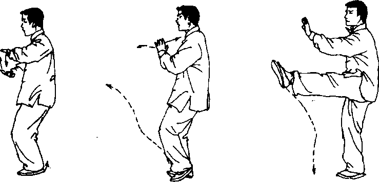 下落,左手稍上提,两手均举于胸部右前方,两臂微屈,左手在右肘 内侧,梅指侧均向上;接着右脚向左后(东北)撤步,重心移于右腿, ? 324 ?
