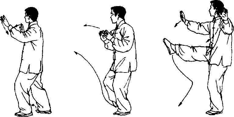 ① 沉肘合手 左腿屈膝微收,左脚向左前下落,重心移向左 腿;两臂慢慢向下沉肘;接着右脚收至左脚内侧,脚尖着地;同时上 体微左转两手里合(与合手姿势相同),眼向右看(图5-68、5- 69)〇