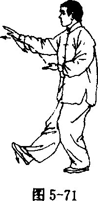 ① 落脚收掌 右腿屈膝微收,右脚向右前(西)下落,脚跟着 地,左腿屈膝;同时右手随之向下前伸,与胸同高,指尖向前(西)手 心向下,左手收至腹前,手心向上,指尖向前,左肘靠肋;眼看右手 (图5-71)。