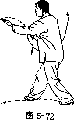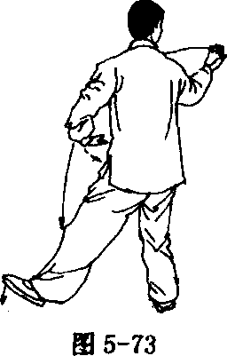 ③ 上步搂托 左脚向前上步,脚跟着地,重心在右腿;上体 右转(胸向西北),随转体右手外旋向下,经腹前向右、向上举至与 肩平,手心向上;左手内旋向右经面前向下、向左划弧搂至左跨旁, 手心向下,指尖向前,眼看右手(图5-73)。