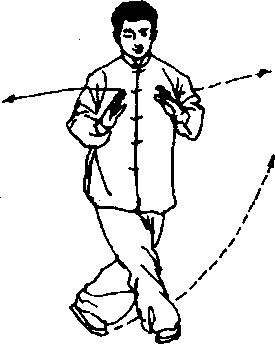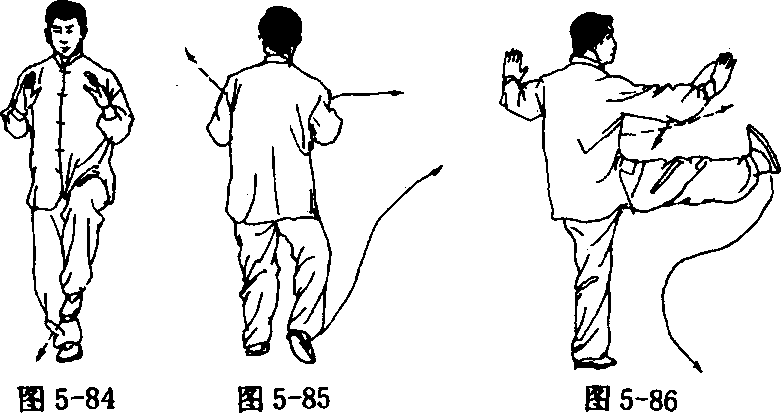 ② 身体微右转,右腿由屈到伸,脚尖向上以脚跟为力点,向右 前(东)、向上蹬出;两手如“单鞭势”左右分开;眼看右手(图5- 86)〇