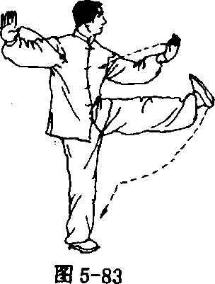 ② 图 5-82两手如“单鞭势”左右分开;同时左腿直腿向左侧抬起,高要 过腰与手相触;眼看左手(图5 - 83)。