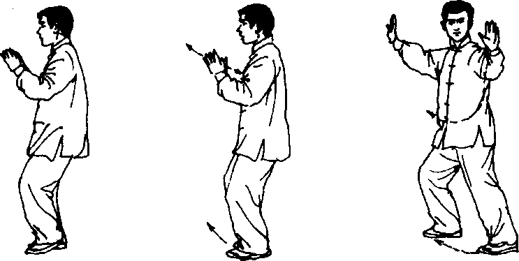 右脚跟里转,全脚踏实(脚尖向西),左脚以脚跟为轴,脚尖右 扣着地,脚跟抬起;随之身右转(胸向西),重心偏于右腿;同时两手 心相对,指尖向上,向左右分开,两手虎口与两肩相对(图5- 101)〇