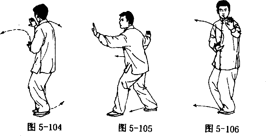 ① 收脚合手 左手收于右脚内侧,前脚掌着地;右腿屈膝, 重心偏佝右腿;同时左手向下、向右划弧于腹前;眼看右手(图5- 104) 〇