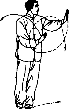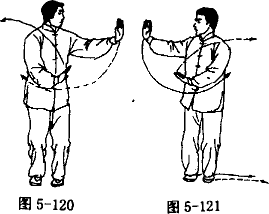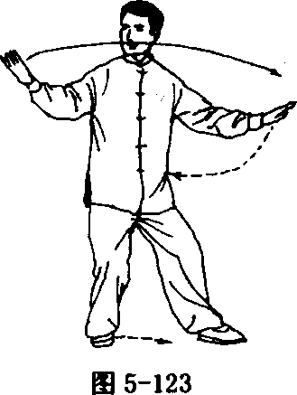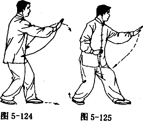 ① 跟步推掌 身体重心移于右腿,左脚向左开步,右手向上 经胸前,向右划弧至右前举,手心向上,高与肩平;左手慢慢下落; 接着身体左转90度(胸向东),随之右脚跟至左脚后;右手随转体 向前平着推出,左手收至左胯外;眼看右手(图5 - 123、5 - 124)。