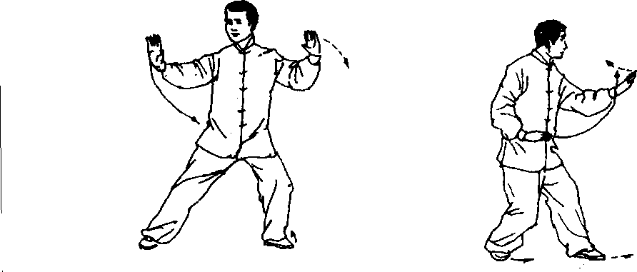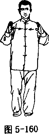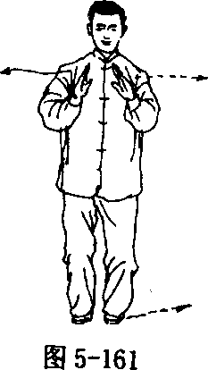 侧,手心均向上;接着重心移向右腿;两手同时向前上(偏向东北) 伸出(在伸的过程中两手内旋),手心均向下,高与肩平,两臂微屈; 眼看两手之间(图5 - 169、5 - 170)。