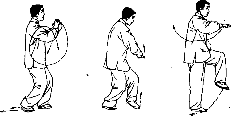 手外旋向下、向左、向上、向右划弧经额前内旋向下按至腹前,手心 向下,指尖向左;同时右脚后撤一步,随即左脚撤至右脚前,脚尖着 地;两腿屈膝,重心移至右腿;接着右手上抬,左腿提膝,脚尖翘起; 眼看右手(图5- 165、5- 166)。