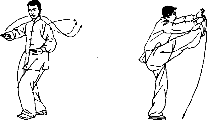 独立摆腿 右脚跟提起,以右脚前掌为轴,身体右转约135