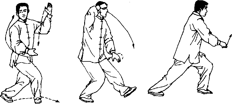.①转体摆掌 左腿屈膝,右腿屈收,右脚前落,脚尖外撇,上