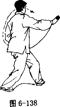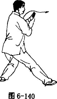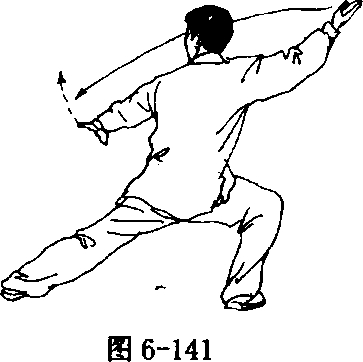 头,掌心斜向上,左掌与胯同高,掌心斜向下;目随左掌(图6 - 141)0