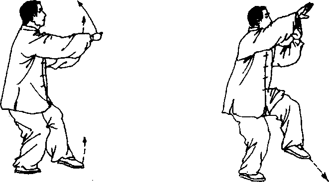 ② 进步时,肩沉、肘灸,臂屈,裆开,脚蹬,使劲力由脚而起,通 过脊背达于右臂滚动向上提架,左掌按发,劲点在两掌缘。