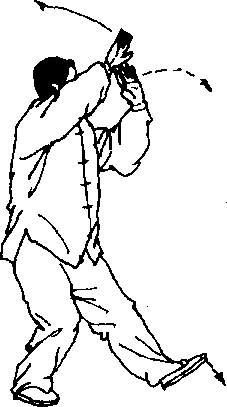 ③ 接上动时,要用意贯通相连,两臂应随腰翻转,有上抛物之 感,连贯自如,右拳先横肘,再竖落,完整一气。