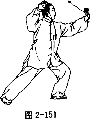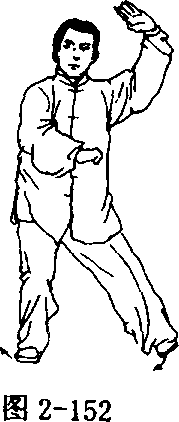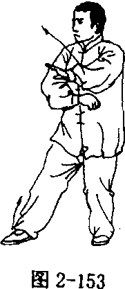 ① 转身握拳 重心后移于右腿;左脚尖翘起内扣踏实,身体 右转,随之重心再移至左腿;同时右掌随转体向右、向下(变拳)弧 形运至左肋旁,拳心向下;左掌向上、向右弧形运至右前臂上侧,掌 心向下;眼看右前方(图2—152、2—153)