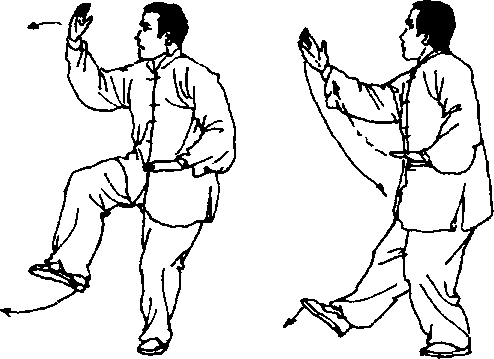 地,然后全脚踏实,左腿風膝前弓,右腿伸直,成左弓步;同时右臂 内旋,右掌举于头的右前上方,掌心向外,臂呈半圆;左掌向前推 举,臂微直,掌心向前,掌指向上;眼看前方(图2—148?151)。