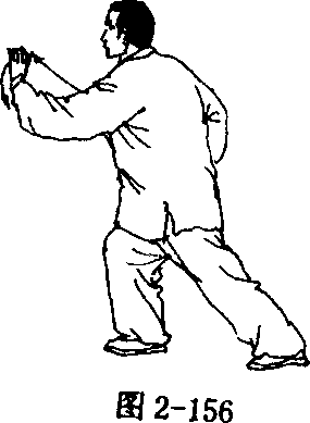 ② 弓步推掌 身体继续右转,右腿屈膝提起,随即向右前方 迈出一步,先脚跟着地,然后全脚踏实,右腿屈膝前弓,左腿伸直, 成右弓步;同时右拳变掌向右前、向下弧形运至右腰侧,掌心向上, 掌指向前;左掌由上向下顺右臂向右前方推出,掌心向前,掌指向 上,臂微直,眼看右前方(图2—154 ~ 156)。