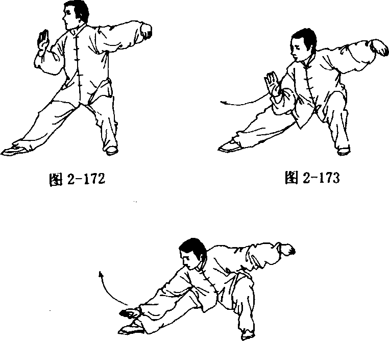 下蹲;右脚掌为轴;脚跟稍外蹬,右腿伸直,成右仆步;同时左拳变 掌由前向下、向后弧形运至左后方,随即变勾手,右拳变掌由前向 上、向里经右胸向下沿右腿里侧向前穿出,掌心斜向下,掌指向前; 上体微前伏;眼看前下方(图2—172?174)。