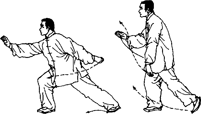 ① 起身时,右腿渐屈,左脚渐蹬,松腰胯,上体要平行前移,劲 于脚下上传腰隙,左胯前送,小腹前移,右膝前领,头有顶意,立身 起立。起左腿时,节节领劲上提。
