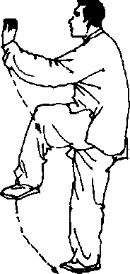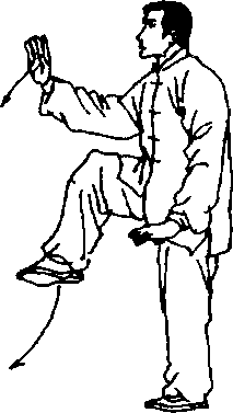 ③ 独立挑掌(右)左脚落于右脚里侧,随之右腿屈膝提起; 同时左掌下落至左腿外侧,掌心向下,掌指向前;右掌由下向前弧 形挑举于前方,臂微屈,掌心向左,掌指向上,右肘与右膝上下相