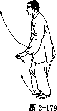 ① 弓步起身 左脚蹬地,重心前移,右腿屈膝前弓,左腿伸 直,成右弓步?,同时身体直起,右掌向前穿举,掌指向前,掌心斜向 下;眼看前方(图2—175)。