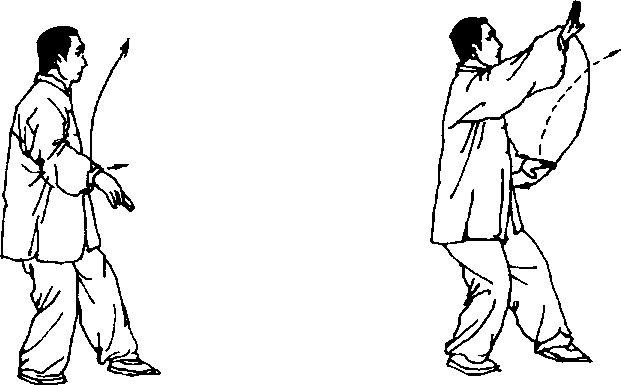 ③ 两臂分开时,以中指领劲,通过两臂,向下松到腰间,下传 腿,再落到脚跟,使劲力畅通,同时在沉落中旋转分开,还要在开展