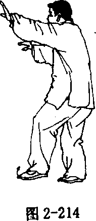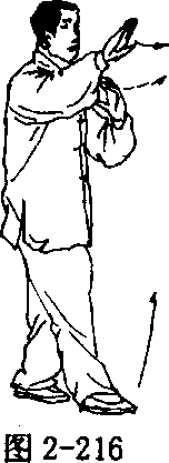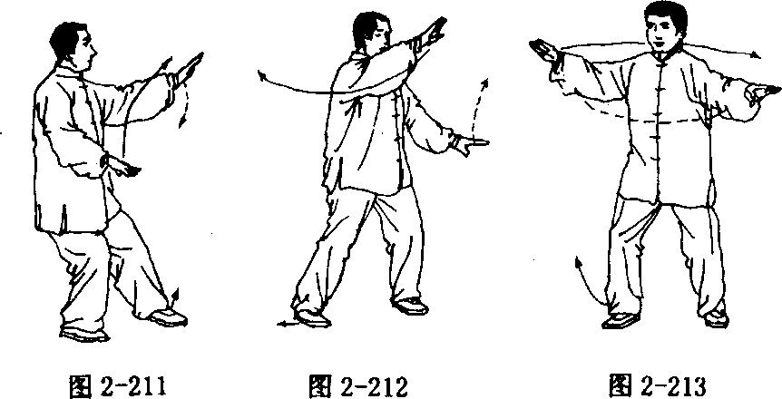 举于体前,掌心向下;右掌由上向右、向下弧形举于右腹前,掌心向 下,随即沿左臂上侧向前、向右弧形移于身体右侧方,掌心向下;同 时左脚掌为轴,脚跟外展,右脚尖外撇,眼看右前方(图2—211 ~ 213)0