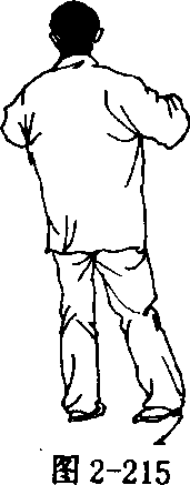 ② 转身摆莲 身体右后转,左腿提起,左脚向右弧形迈步, 脚尖内扣踏实,身体继续右后转,两脚随转体自然转动,身体重心 落在左腿;右腿微屈,成右虚步;同时,两掌随转体向右后平形运 转;右掌移于身体右前方,掌指向上,掌心斜向下;左掌置于右前臂 里侧,掌心向里,眼看右前方(图2—214?216)。