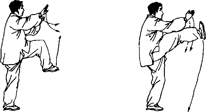 ① 转身迈步和移动重心要灵活稳健。摆腿时,右腿弧形上摆, 上体可微向前迎,但不可紧张。