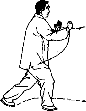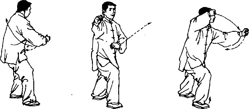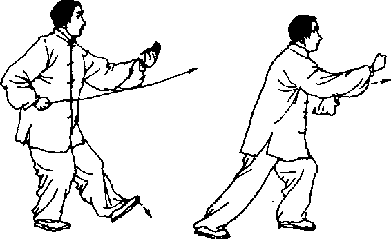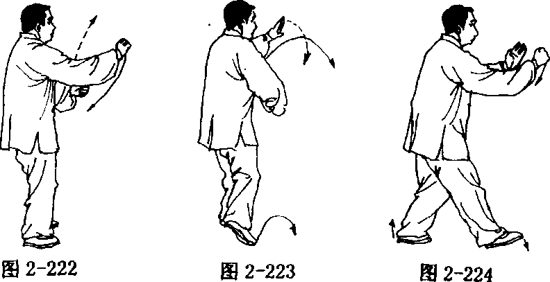 向前迈步,脚尖外撇,同时右拳向左下向里、向上弧形向前搬出,左 拳自前而下弧形移至胸前,掌心向右,掌指向上;眼看前方(图2— 222~224)〇