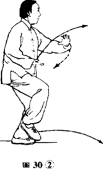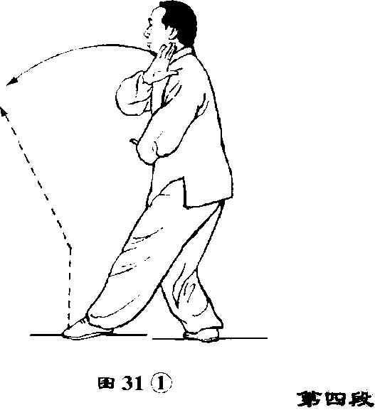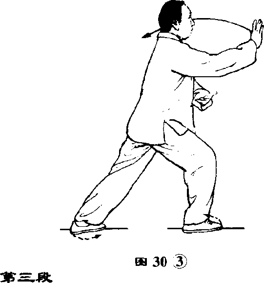 上体左转;左手内旋微禱雜 下落;右手外旋收宇右胯奢;接 着,重心金部移變垄褪;右脚随屈 騸I至左小鼸内侧;左手臂塵随 横置于胸前,手心晒赫廳續 收于右肋下,手雜向上^〖酶30① ?②)第玉段右脚向前落步,重心慑慢前 移成右弓步;伺时右手经左手臂 上向削推出,手心向削,指尖向 上,腕与肩伺高;左手屈肘收至右 时下约距10纒米,手心向上,指 尖向右;眼看右手。(圈30③)要点:上下协调一致,动作要连贯 完成0