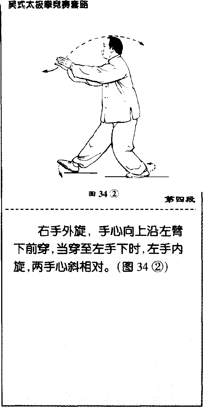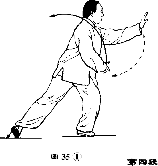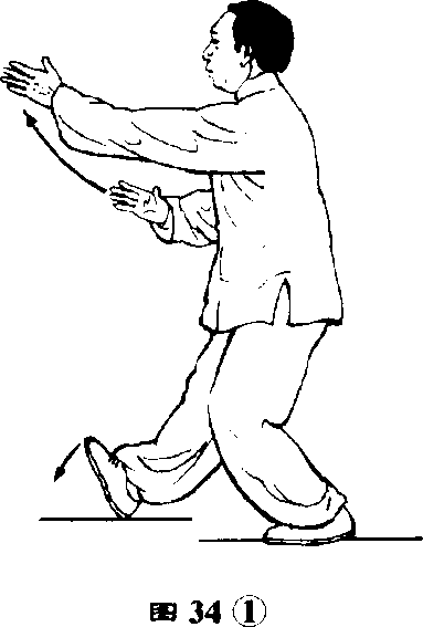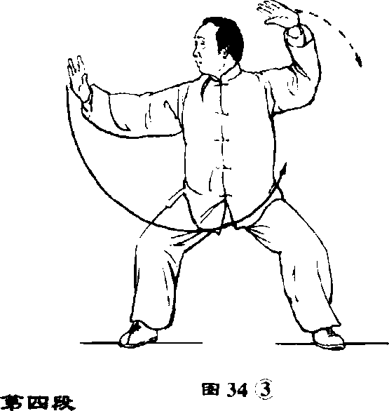 麵麵①两撮雜膝,羅麵臟左 腿;右脚痴葡迈半泰,棚蹋難^ 随迈步左手臂上举謹与庸平,手 心向右。(图34①)麵麵右脚尖落地并内扣;左脚攀向 外碾转,两膝微屈,身体左转(胸向 南〕;随转体右手立拳向右維按、臃 与肩平;左手屈肘上架手左前上 方,手指略高于头,手心向外;眼看 右手。(图34③)