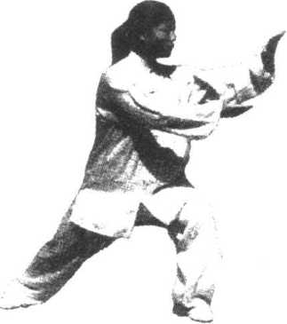 (3)上体微左转,左脚向前迈出一步,重心前移,右腿后 蹬,脚跟后展,成左弓步;同时左前臂向前拥出(即左臂呈弧 形,用前臂外侧向前上方架出),高与肩平,掌心向内,右掌 向下按于右胯旁;眼看左前臂(图3. 41)。