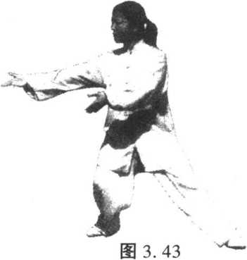 (5)上体右转,两掌下捋并经腹前向右后上方画弧,右掌 心斜向上,高与肩平,左掌心斜向后,左前臂平屈于胸前;同 时上体后坐,右腿屈膝,重心偏于右腿;眼看右掌(图3. 43)。