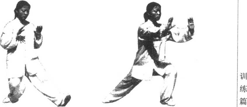 要点:由捋变挤时,两手向身后摆开。由挤变按时,注意 缩胯、敛臀,上体正直,不可前俯后仰。