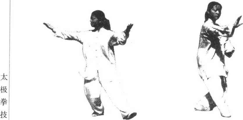 (1)上体右转;右拳变掌,掌心向上,由前经右胯侧向后 画弧平举,肘部微屈,随之左臂外旋,掌心翻向上;左脚轻轻 提起;眼随转体先向右看,再转向前看左掌(图3. 56)。