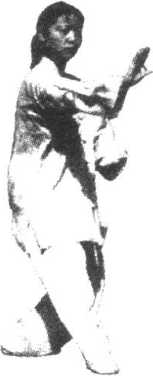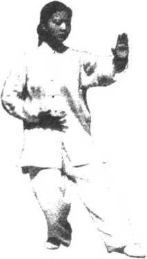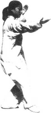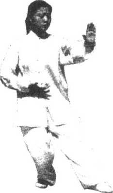 (4)右脚轻轻提起向后退步,前脚掌先落地,随之全脚踏 实,重心移至右腿,左脚脚跟微外展,左膝微屈成左虚步;左 掌屈肘卷收经耳侧向前推出,掌心向前,高与肩平,右掌向 下、向后撤至右胯前;眼看左掌(图3. 59)。