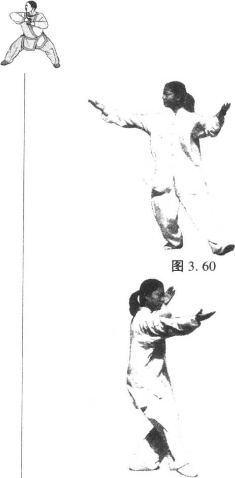 图 3. 62图 3. 62图 3. 61图 3. 61图 3. 63图 3. 63太 极 拳 技 巧太 极 拳 技 巧要点:退步时,前脚掌先落地,然后全脚踏实,重心后 移,做到虚实转换清楚。同时两脚要保持约10厘米的横向距 离,两腿不要成交叉状退步,以免重心不稳。