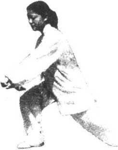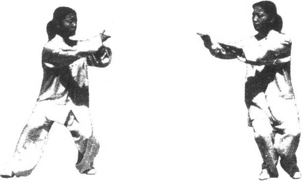 要点:两臂沿平圆和立圆交替画弧,衔接力求圆活,要以 腰带动。定势时,上体不可过于前倾,步型为拗弓步。凡拗弓 步步型(搂膝拗步、左右穿梭等)要注意保持两脚间的较大跨 度,做到重心稳定,上体自然。
