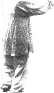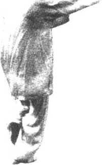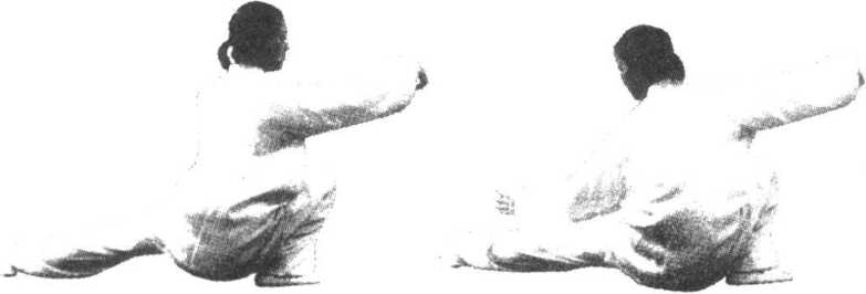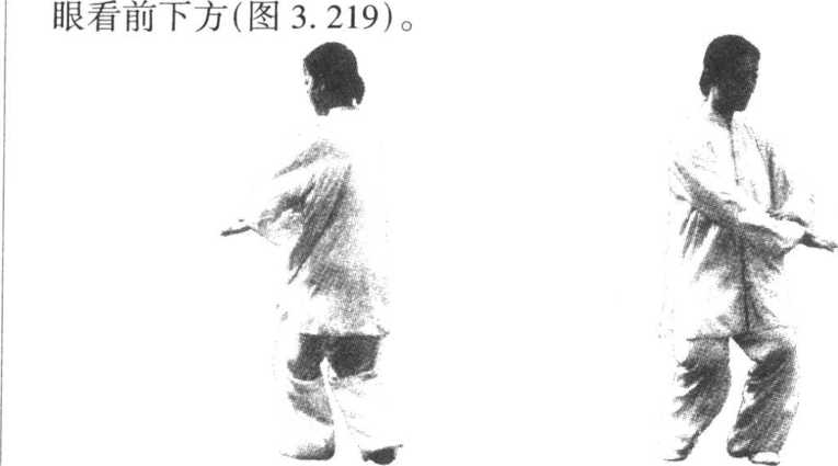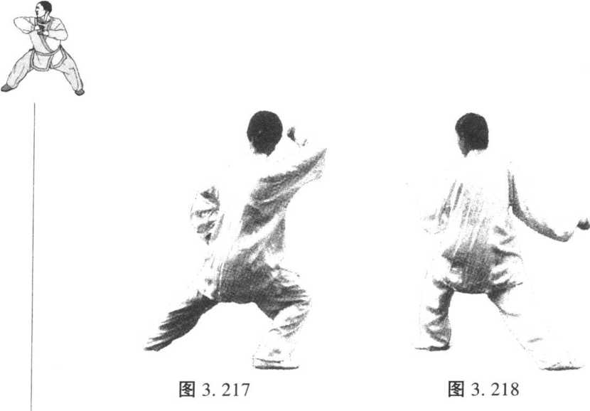 (1)上体右转,重心移向右腿;右臂屈肘向上画弧,右拳 停于右额前,拳心向外,左拳自腰间向身后穿出,拳心向后; 眼看前方(图3. 217)。
