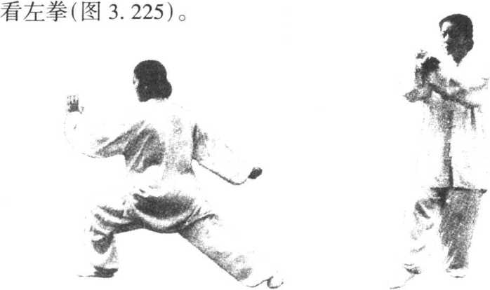 (1)重心前移,上体左转;左脚尖外展,右脚尖内扣,右 腿自然蹬直,左腿屈弓;左掌向上、向前挑起,高与肩平,右 臂内旋下落,勾尖向上,停于身后;眼看左掌(图3. 224)。
