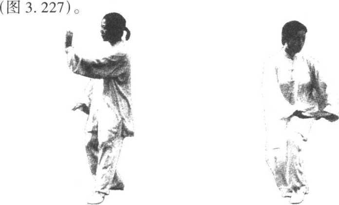 (1)右脚向右后撤一步,重心后移,上体右转;右拳变掌 向下、向右画弧,停于右胯外侧,掌心向下,左拳同时变掌随 身体右转稍向石画弧(图3. 226)o