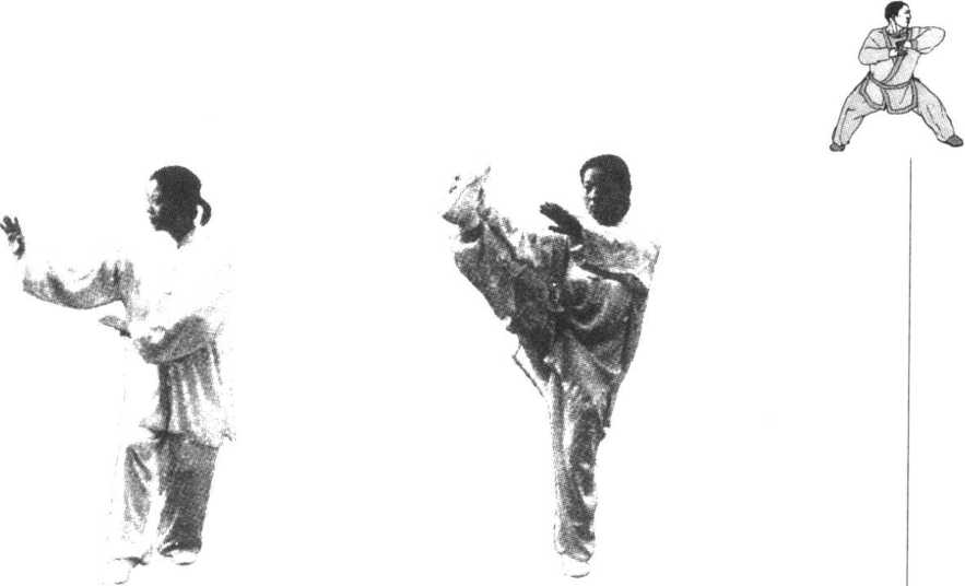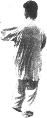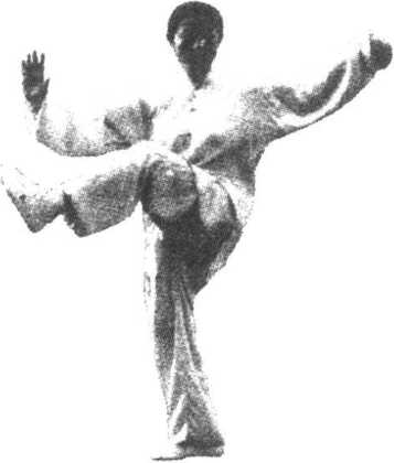 要点:定式时,右腿独立,膝部微屈,左腿似直未直,自 然地悬举于体前,左脚略内扣,高度因人而异。右手、左脚大 体上下相对。上体扭向西南,保持自然舒展。