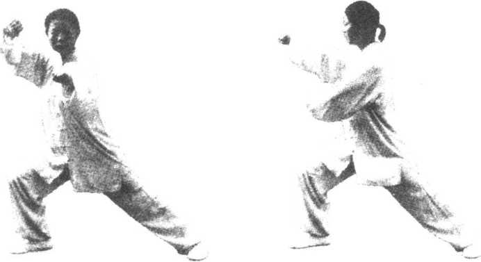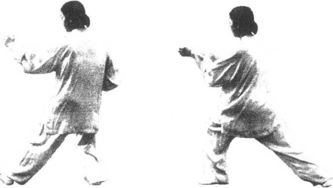 要点:两手向右摆动时,头、腰都要随之转动,眼看右 拳。定式时,腰向下松沉并稍向回(左)旋,但右膝不要内扣, 也不要向左扭胯。头转向西南和左拳方向一致。弓步方向略偏 西北。