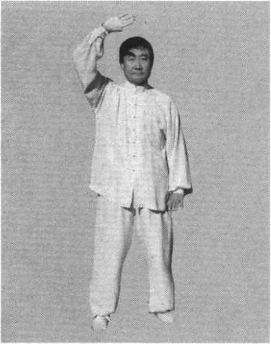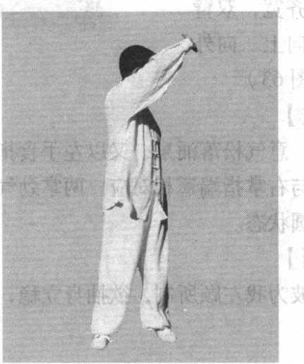 右腿前弓,左脚随之向前并步与右脚齐,呈平行步,提 顶松腰,身体渐渐直立;同时,右掌旋腕,掌心自内而下、 而前、而上,横掌提举 至顶上,右臂举起,肘 部微屈成为半圆;左手 下按至左胯外侧,五指 向前;面向正南,双目 平视。(图61)