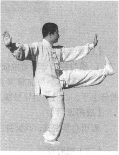 外摆45。,左脚上跟半步蹬直,呈交叉步;面向左方(正东), 目平视。(图122)