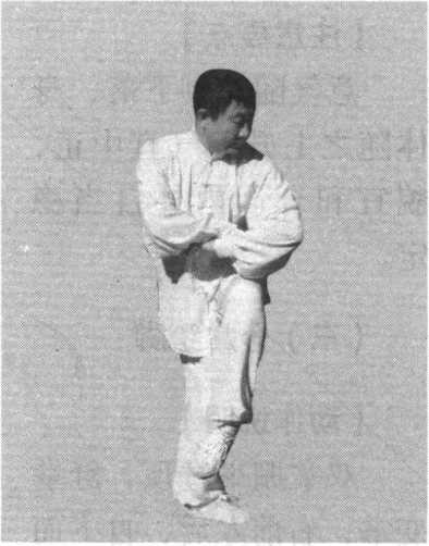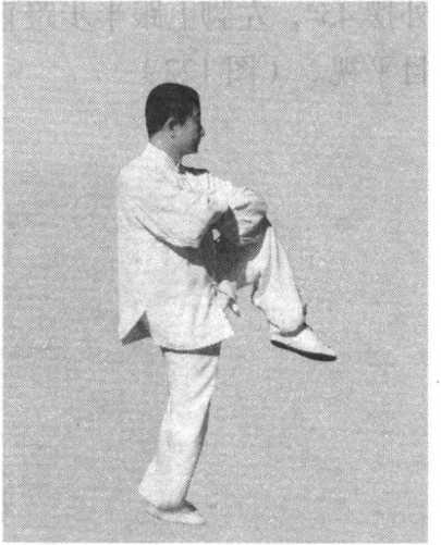 提顶松腰,重心移至右脚,右腿直立,左膝提起,高与 胸齐(或与股齐),左脚脚尖下垂,呈独立状;同时,双手握 俯拳,向右下方回揽,右上左下,前臂相交叠抱于右肋前。