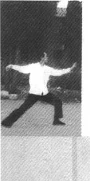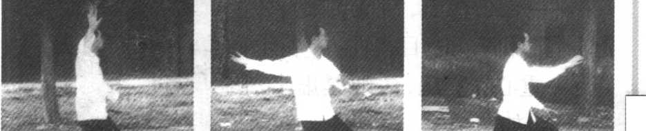 (2)重心向左坐左腿,腰微向左转开胸,同时左掌随 转腰开胸,往左移于左耳侧,如图82。